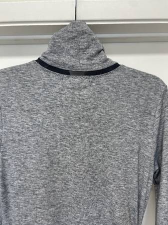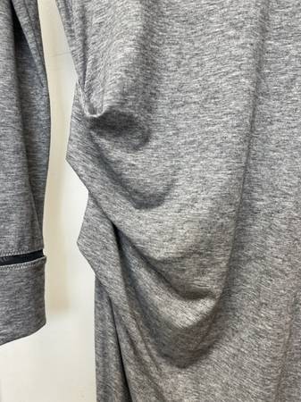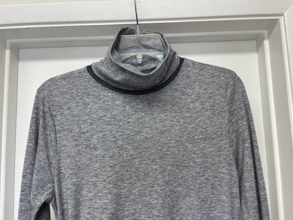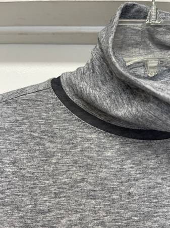 Heathered gray. Turtleneck. Gathered on one side. Long sleeves. Mesh trim at neck and sleeve ends.