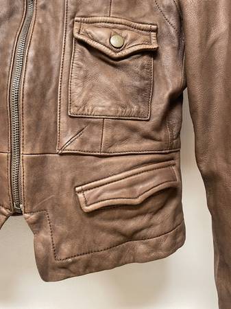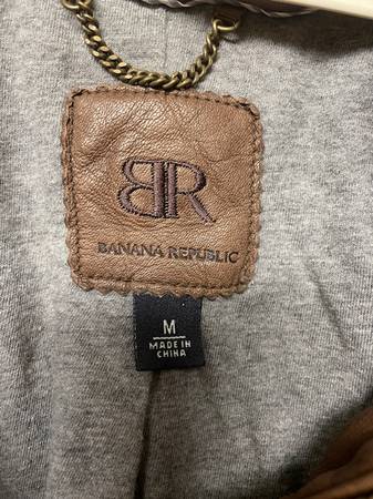 Very cool Banana Republic Brown Leather Jacket.. it's a size Medium but fits more like a Small. It's well broken in and has some natural fading as genuine leather does.