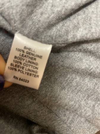 Zip front with 5 pockets. Shell is genuine leather. Body lining is cotton and sleeve lining is polyester.