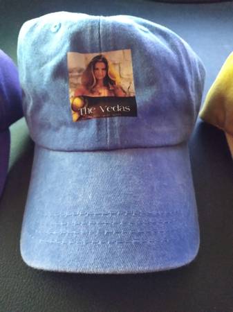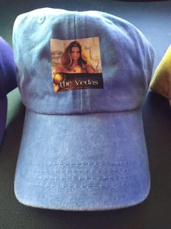 a blue cap with "The Vedas," and