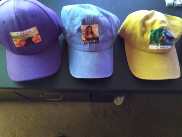 Set of 3 baseball caps in purple, light blue, and yellow.