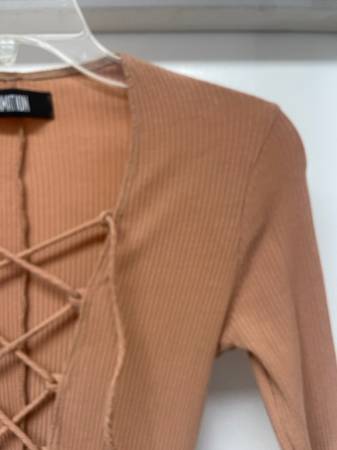 Tan/ blush color. Deep V lace up neckline. Long sleeves. Body hugging fit with stretch to the fabric.