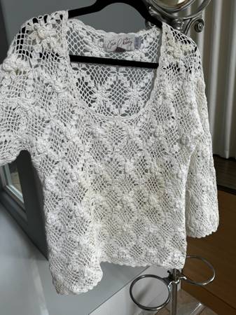 White Crochet Top with large scoop neck and the perfect amount of Peek a Boo