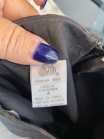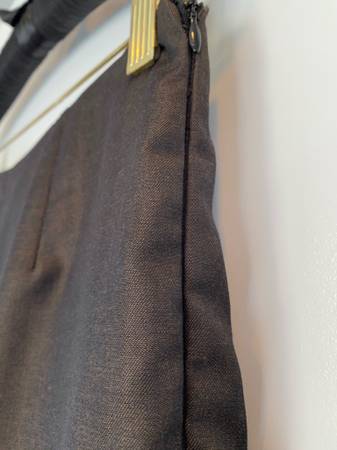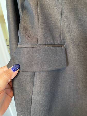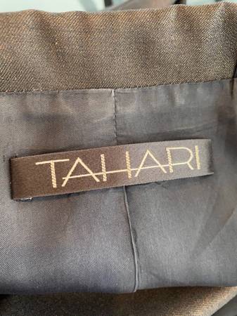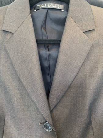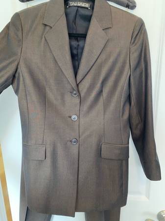This Tahari suit is very well made with quality fabric and hidden zipper on the pant. The fabric has a hint of shine to it which makes it very buttoned up looking. It's very flattering on.