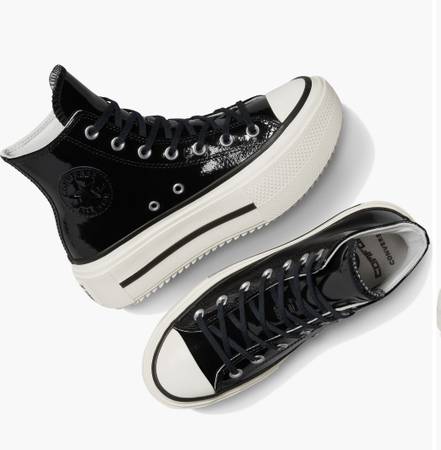 These high-top Converse feature a shiny patent leather upper and a bold double-stacked platform sole that elevates both height and style. The chevron-pattern tread provides traction, while the removable OrthoLite® insole adds cushioning and comfort.