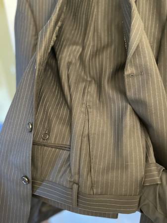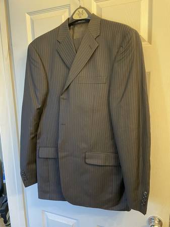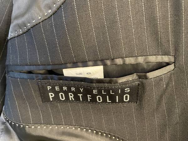 Perry Ellis Portfolio Suit - Jacket and Slacks Black with pinstripes Jacket is 42L Slacks are 36W 36L Worn once dust cover and hanger included