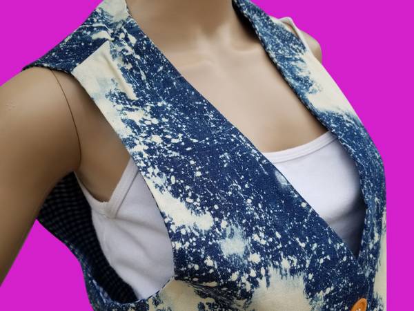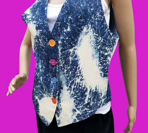 This eye-catching vintage vest features a bold acid-wash denim look with multicolor buttons for a pop of retro charm. It has a V-neckline, pointed hem, and a fun blue gingham inner lining. Perfect for layering over tanks, tees, or turtlenecks for a standout 80s inspired outfit.