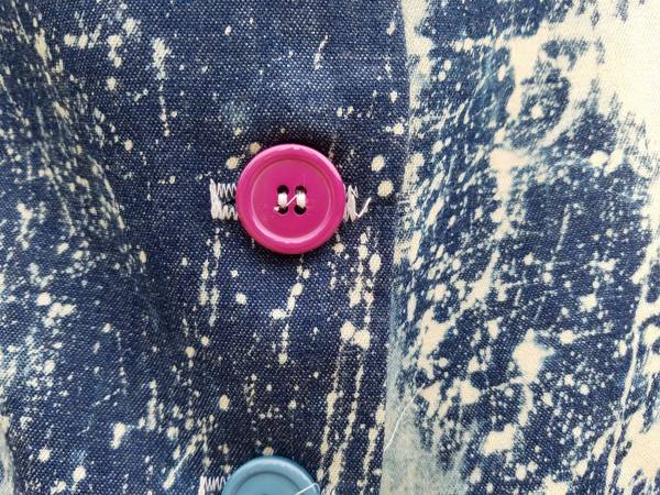 • Front button-up closure with orange, blue, pink, and yellow buttons
