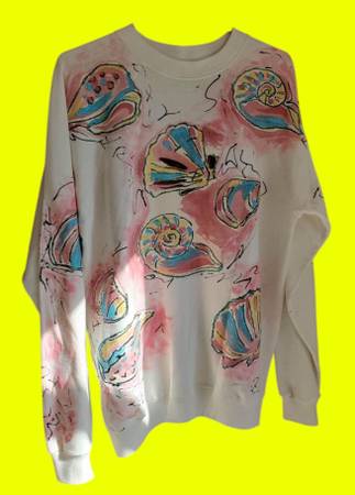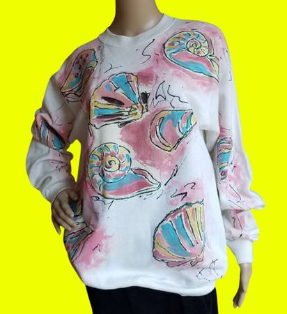 This vintage sweatshirt features an artistic seashell print in vibrant colors on a clean white base. Its relaxed fit and timeless design make it a versatile addition to a wardrobe. Crafted for comfort and style, it provides warmth while adding a pop of color to your outfit.