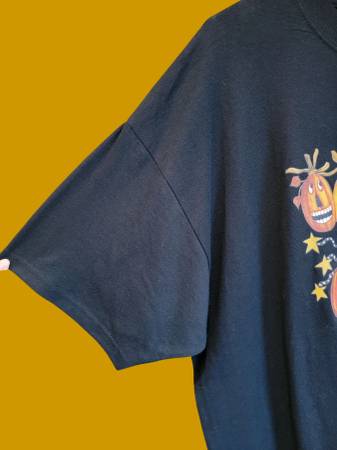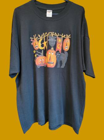 This Halloween-themed t-shirt features a playful pumpkin and black cat design, blending comfort and durability with its heavyweight cotton-polyester fabric.
