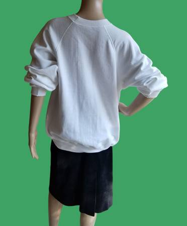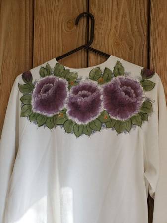 • White Crewneck style with painted purple flowers and green leaves around front collar.
