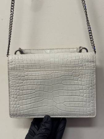 Saint Laurent Calfskin Crocodile Embossed Medium Monogram Sunset Chain Bag Great Condition Minor Stains on Interior From Normal Wear Color: White Material: Leather Finish: Clafskin Crocodile Model:...