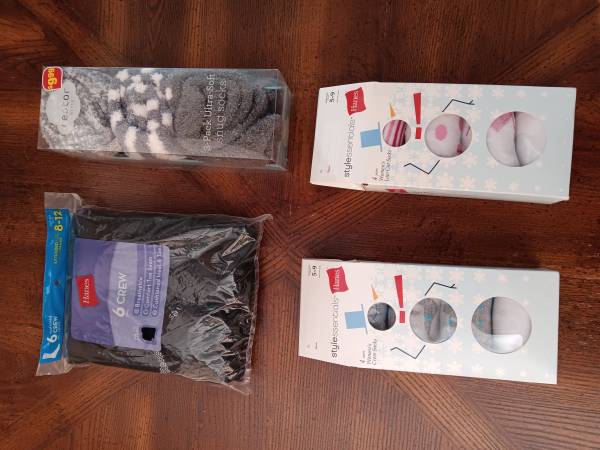Brand New Restore style 3 Pack Ultra Soft Snug Socks. Grey shades. $7. Brand New Hanes Pack of 4 - Women's Crew Socks, size 5-9, 3 pairs of grey and one pair of white. $5. Brand New Hanes Pack of 4...