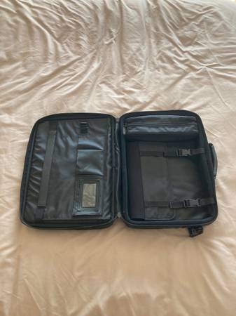 Gently used in excellent condition black nylon laptop bag great for travel. This bag has a removable shoulder strap that is padded at the shoulder for comfort. It’s got several compartments to come at eight devices of different sizes, a separate removable compartment for a power, adapter, identification, writing materials, and more. It measures 16” x 12” x 5”. Cash only.