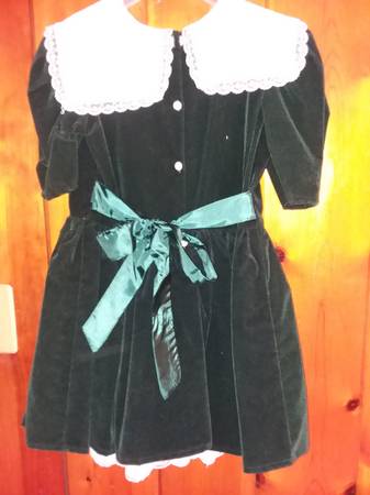 Brand New Pretty Girls dress, green velvet like with off white lace. It says size 10. Waist 24", Length 28".