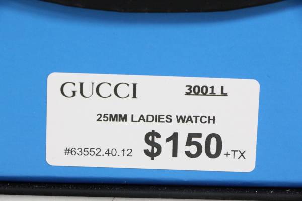 We are selling our Gucci 25MM Ladies Watch 3001 L. Box shown in pictures is not included. Please call or text with questions . Please reference Stock # 63552 when you call. ppc