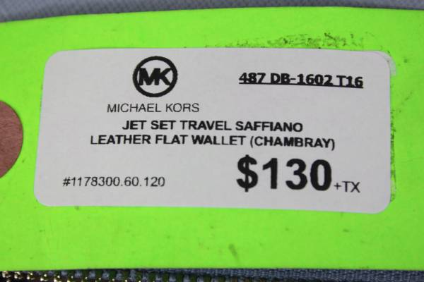 We are selling our Michael Kors Jet Set Travel Saffiano Lather Flat Wallet 487DB-1602T16. Please call or text with questions . Please reference Stock # 1178300 when you call. ppc