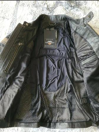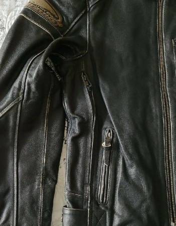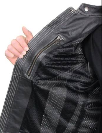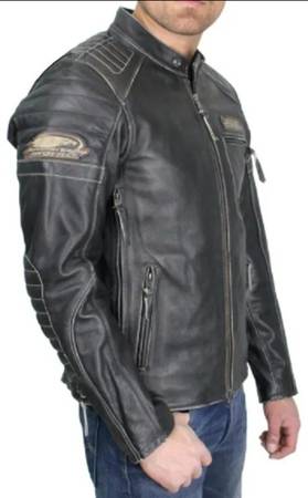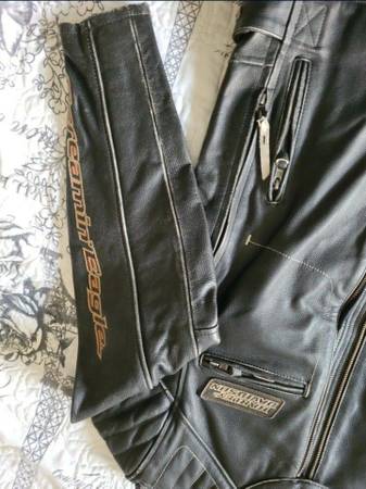 Harley-Davidson® Men's Screamin' Eagle Leather Jacket, 98028-18VM. Two front vents and two back vents for airflow. Action back. Padded shoulders and elbows. Pre-curved sleeves and snap waist tabs. Two-way zipper front and zippered cuffs. Body armor pockets at elbows, shoulders and back. Zipper hand-warmer pockets and chest pockets. One interior stash pocket and one interior zipper pocket. Distressed leather for vintage look. Dirty leather patches and embroidered graphics. Heavyweight cowhide leather. Polyester mesh lining. 98028-18VM.