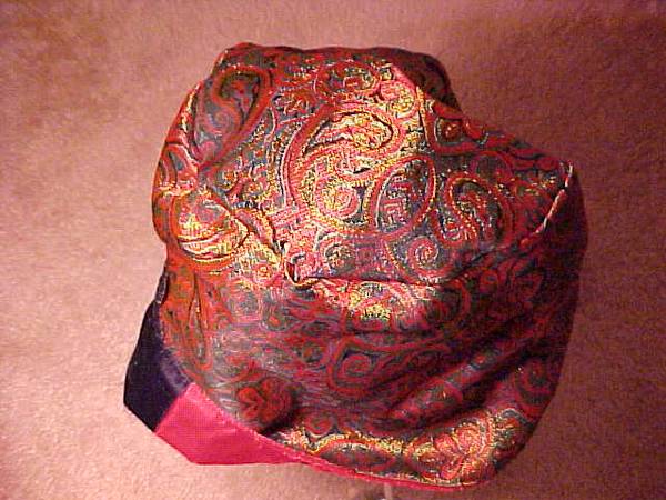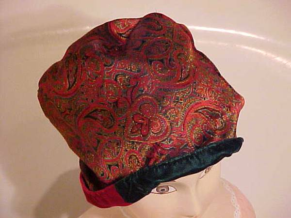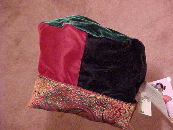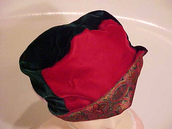 This is a Venitian Paradise hat. Red, dark green and black velvet patchwork reverses to a rich red brocade. Never worn. Tag still attached. Excellent condition. Pick up only.