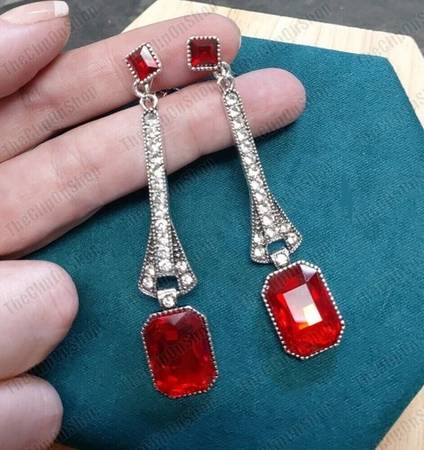 1 - pair of long, dangling red crystal and rhinestone earrings