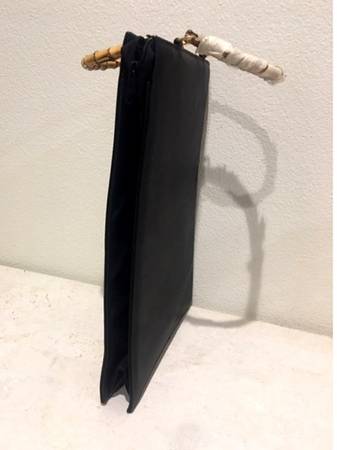 This is a brand new purse which is super useful for someone looking to tote around their laptop computer or a notebook because it is extra long and fits many office items. It is water-proof black fabric (almost like raincoat material and has two chique' bamboo handles on top for easy carrying. (They are still wrapped from the manufacturer except I had to unwrap one to take the photo and show the bamboo design.)