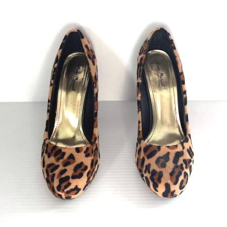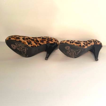 Here I have a Women's Size 9 sexy leopard pump for sale, by designer Anne Michelle. They are made from Tan, Camel and Black leopard fake fur, and the heel is done in a shiny patent leather in all black. The heel is 4.5" high. The toe is slightly rounded.