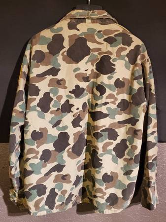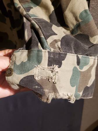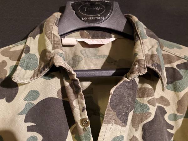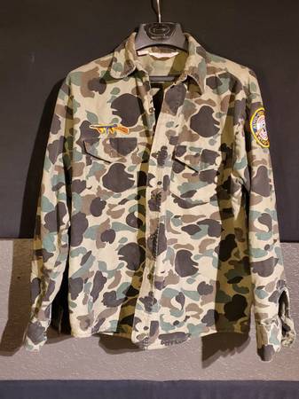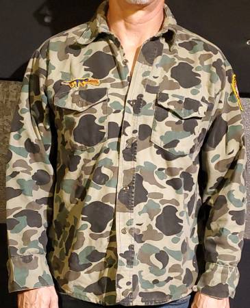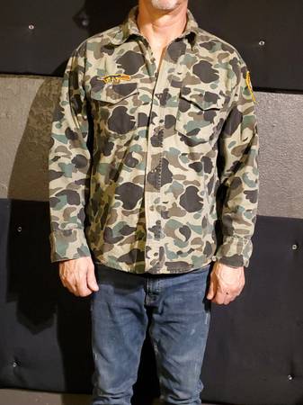 Men’s Medium Size Army Camouflage button up shirt (jersey) with the Tommy Gun Logo sewn on above the right chest pocket. There is another patch on the left arm shoulder area for the Thompson Gun (see photo). In the pictures the shirt looks brown but it’s actually green!! The colors on the shirt are clear and classic, a light green base with brown and green color patches. The shirt is very comfortable, only lightly worn. There is some small tearing on the left sleeve but it’s not bad or even noticeable. No holes, no stitching problems, no color fading, no stains. Shirt has all its original buttons. The sleeves were short for me so this shirt is a probably a medium size. Best Endorsed by Jim "Catfish" Hunter. For size estimate see picture with 5’ 11”, 175lbs model. Width 22”, Height 27”, Arms 23”