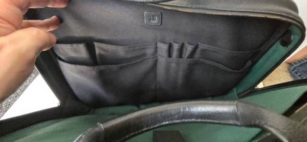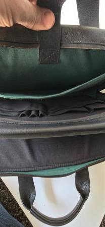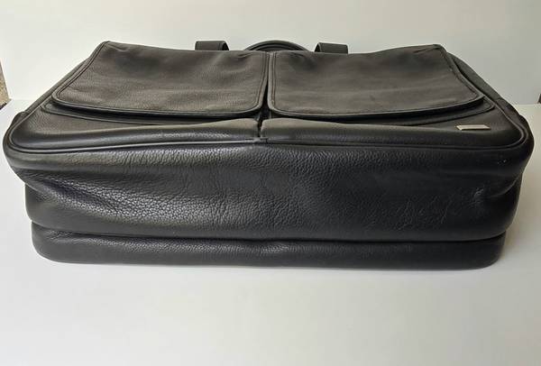 Really nice bag. Measures about 16x12x4. No shoulder strap.