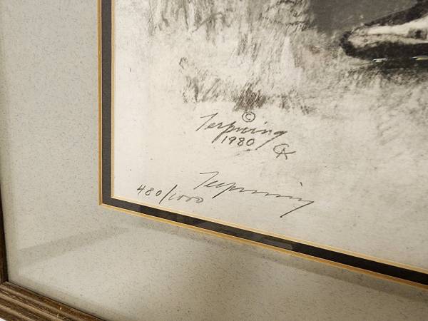 The art is in great condition, but frame is a bit scratched in some places and the paper on the back of the framing is ripped (see pictures)