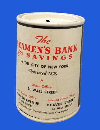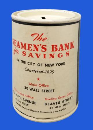 Ultra Rare Vintage 1920s The Seaman's Bank for Savings from the City of New York. Nautical Tall Sailing Ship Coin Tin Piggy Bank. The Coin Slot Is In The Top. This bank has been in storage in our home for many years and as shown in excellent condition for 96 years old. Tin Coin Top opens and closes for coin insert and removal.