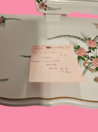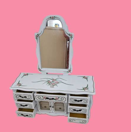 This charming vintage-inspired 60s/70s French Provinical miniature dresser jewelry box, with intricate floral hand-painted details and a functional mirror, evokes nostalgia. Ideal for storing small treasures and adding antique flair to your decor. There are some wearing of paint and bottom right hand drawer handle missing. This is a nonworking musical jewelry chest.