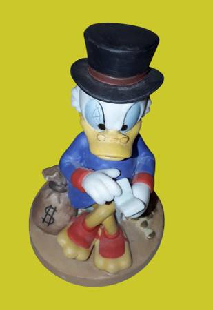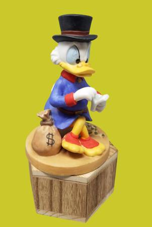 This charming hand-painted Disney Scrooge McDuck figurine features intricate details that captures the classic Disney character, including a money bag and ledger. A timeless collectible for Disney enthusiasts of vintage decor.