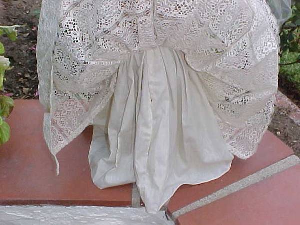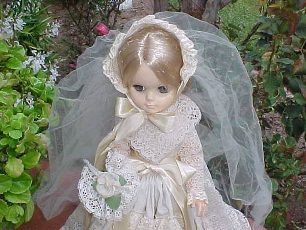 All vinyl, jointed at neck, shoulders and hips; Rooted hair, very large blue sleep eyes; closed mouth. All original clothing including both socks and shoes. Marked on the lower back of the head, Effanbee 19O65 1700. For record the O has a c in the center. Doll has been packed away for years. Metal stand is included.