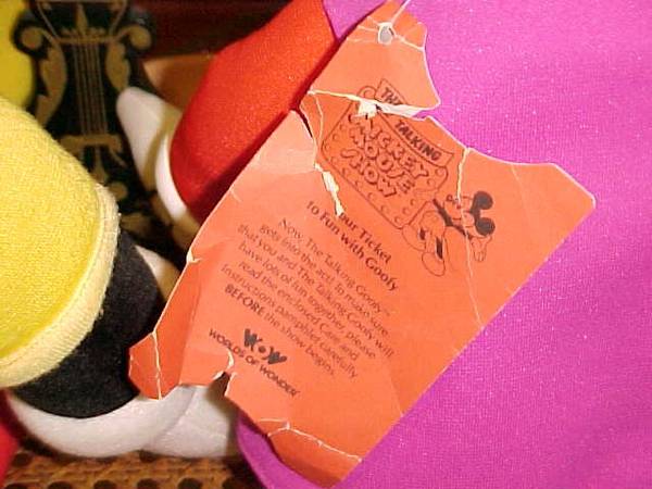 Connect Goofy's connecting cord. The Talking Mickey Mouse starts the show when you insert his special animation cassette into the cassette player in his back. As Mickey talks his eyes, nose and mouth and Goofy's eyes, nose and mouth move in synchronization with their voices. Voices and other sounds are clear and strong. You can follow along with the never used full color storybook.
