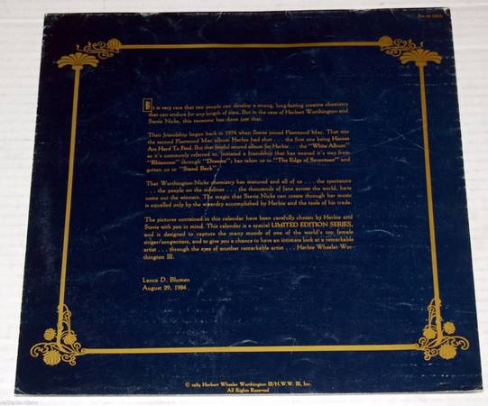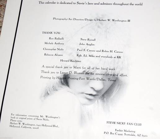 STEVE NICKS 1985 photo calendar featuring photos by Herbert Worthington. Calendar is limited edition #3661 but I don't know what the edition size is.