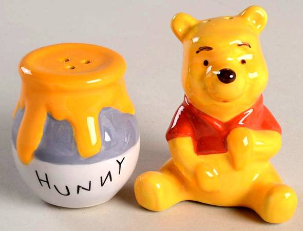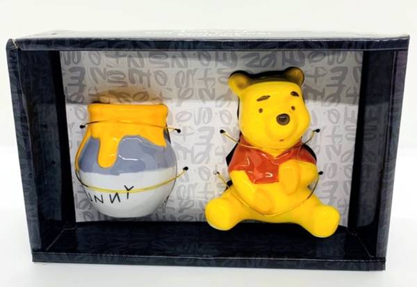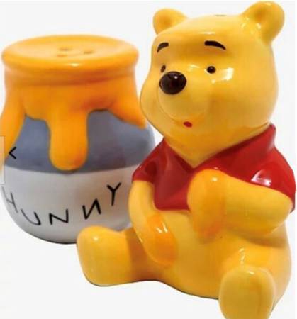 This BRAND NEW shaker set is adorable and still in its original packaging. It is PERFECT for a Disney lover, or a Winnie The Pooh fan. The honey pot is for pepper and it measures 1.875" Wide X 2.25" Tall and the Winnie the Pooh piece is for salt and measures 2.375" Wide X 2.87" Tall. These are Disney certified.