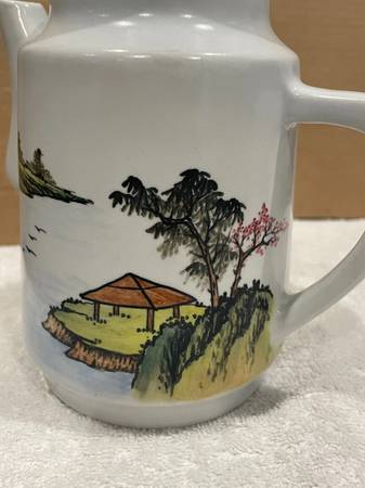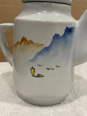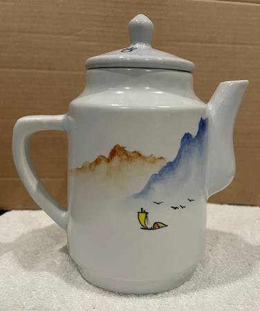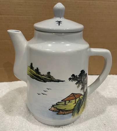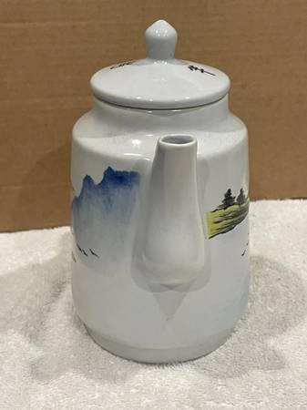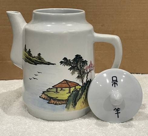 WHITE PORCELAIN TEAPOT WITH LID, FEATURING A HAND-PAINTED SCENE OF A HOUSE, TREES, AND BIRDS IN A NATURAL SETTING.