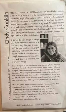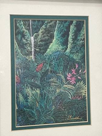 This beautiful print by Cindy Conklin features a stunning Hawaiian waterfall and rainforest scene. The artwork was produced in 2003 using lithography and is an original piece signed by the artist. The print is small in size and comes matted and framed, ready to be displayed in your home. The style of this print is Caribbean, island, and Hawaii, with a forest and waterfall theme. It is a perfect addition to any art collection and will add a touch of nature to any room. This handmade print is a must-have for anyone who loves art and nature.