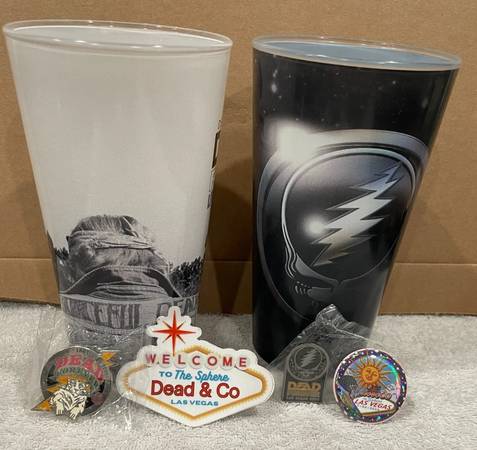 The product is a set consisting of two pins and two cups, as well as additional items related to the band. This music memorabilia captures the essence of the Grateful Dead's enduring legacy and is a must-have for fans of the rock and pop genre. The items are original and made in the United States, making them a unique and special addition to any collection of concert memorabilia or entertainment memorabilia.