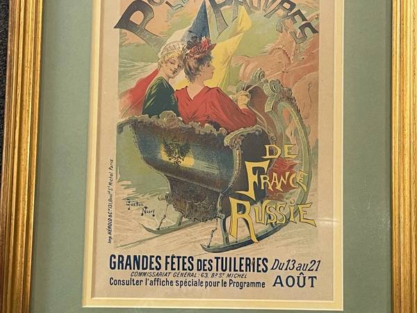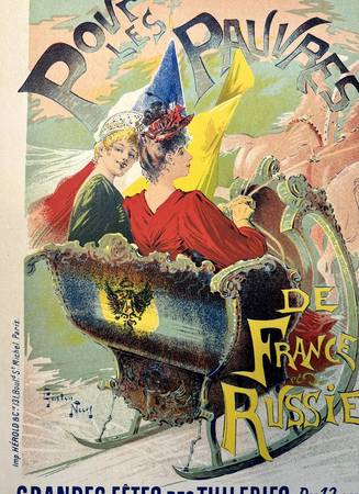 THE ARTWORK DEPICTS TWO ELEGANTLY DRESSED WOMEN IN A SLEIGH, SYMBOLIZING FRANCO-RUSSIAN SOLIDARITY AND THE CHARITABLE CAUSE.
