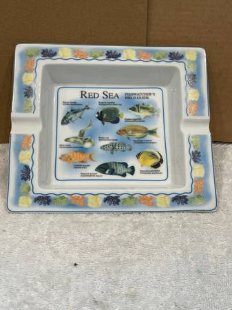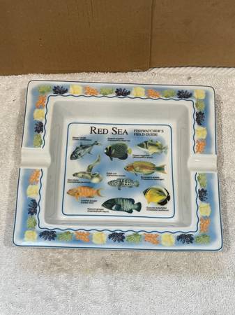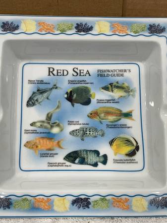 THE ASHTRAY DEPICTS A FIELD GUIDE LAYOUT OF VARIOUS FISH SPECIES FOUND IN THE RED SEA, WITH THEIR NAMES LABELED.