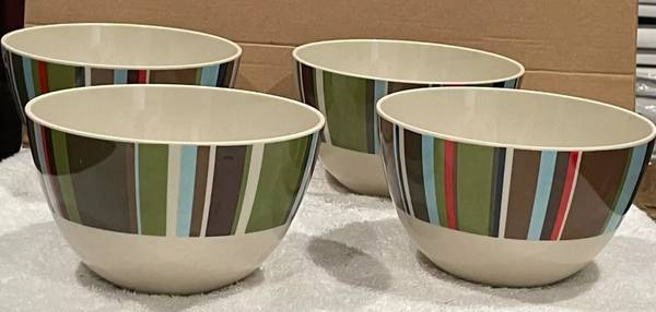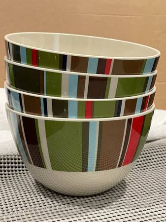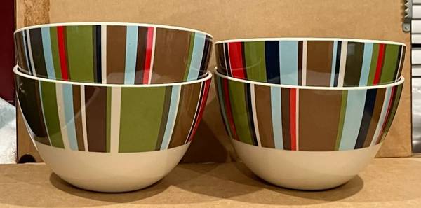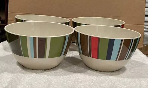 Enjoy your morning cereal in style with this set of four melamine cereal bowls, each boasting a vibrant striped pattern that adds a pop of color to your breakfast table. Crafted from durable melamine, these bowls are perfect for everyday use and can easily transition from a cozy breakfast nook to a bustling dinner table, suitable for all occasions. The round bowls each measure 6 inches in diameter and 3 1/2 inches in depth, providing ample space for your favorite cereal, fruit, or even entrees. They are designed for the top shelf of your dishwasher only and are not microwave safe, ensuring both the durability and safety of your melamineware. Whether for yourself or as a thoughtful gift, these striped cereal bowls are a charming addition to any kitchen.