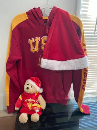 The Vintage USC Trojans Plush Bear is a unique collectible item featuring a plush bear with an attached football and X-mas hat. Made of polyester fiber and originating from China, this Americana-style piece is a post-1940 reproduction by Forever Collectibles. The multi-color design adds a fun and nostalgic touch to any antique collection, perfect for fans of the USC Trojans or football enthusiasts alike.