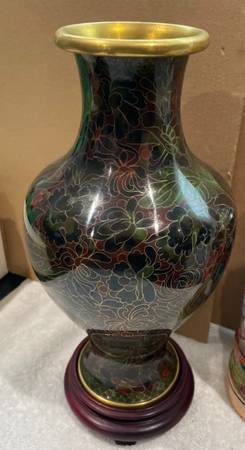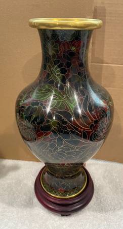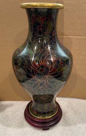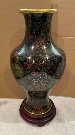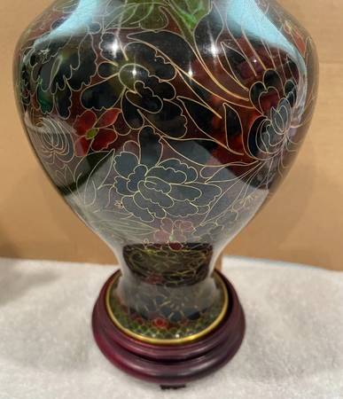 This vintage Chinese cloisonne enamel vase is a stunning piece that will add elegance to any space. The vase is made of brass and features intricate enamel work that depicts a floral motif. It stands at 10 1/2" tall and comes with a beautiful wood stand, making it a perfect display item for your home or office. The intricate details and exquisite craftsmanship of this piece make it a true work of art that will be cherished for years to come.