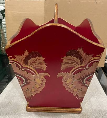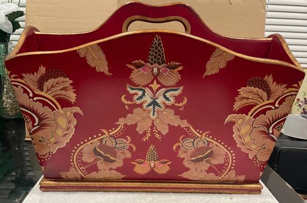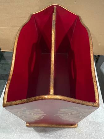 This vintage magazine holder is a Florentine style hand painted toleware design featuring floral theme with gilt accents. The holder has two compartments.