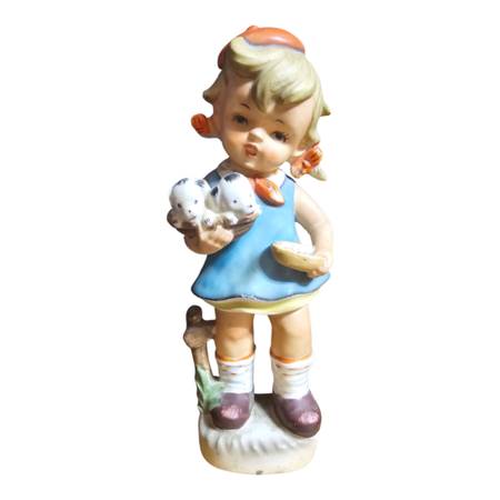 It features a young girl with a red beret and pigtails, dressed in a blue outfit, and holding two small puppies. Condition: It's got scratches, and one of the pigtails is missing.