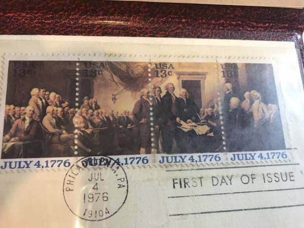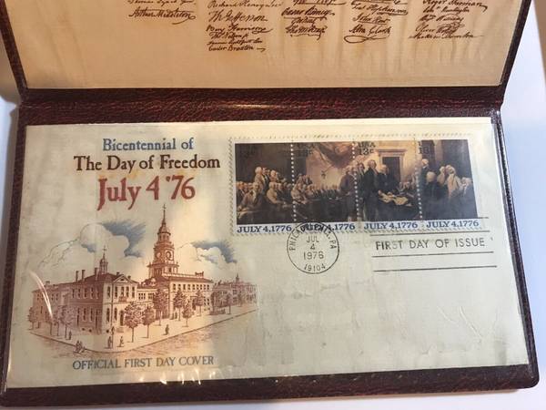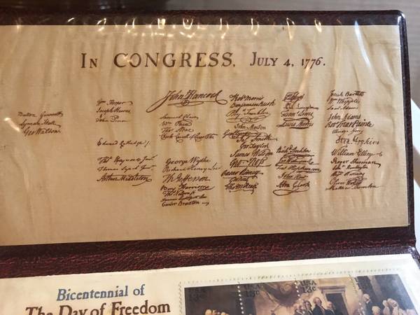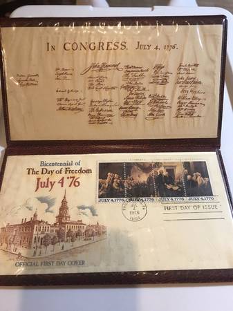 The signatures of the first Congress from the proclamation of Indepence on July 4th 1776. Envelope with Official First Day Cover and 4 Congressional stamps of that day. Keep stake for Historian or...