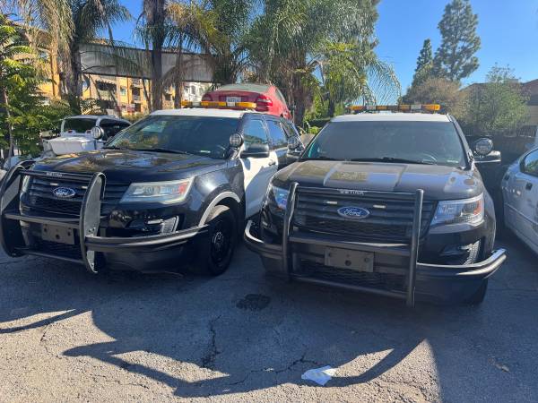 Hello thank you for inquiring up for sale are 2016 Ford Explorer Police suv models fully equipped for security, bounty hunting, decoy, or for personal use. These two explorers are identical both 2016 one with 161k very well maintained miles on clean title the other is 171k very well maintained miles with a clean title from the same department. The light bar is fully functional the LED spot lights as well. Both these units very very very costly accessories installed in them by there respective police department. Bull proof doors, window cages, prisoner seating, assault rifle holder, pit maneuver front end with led lights in the front back and side too much to list! The back on both identical with storage compartments this department spend a lot of money on these suvs and they run AMAZINGLY WELL SMOG CHECKED pass ready to go! These explorers can be used all the way to almost 500k miles easily! Powered by a 3.7 ltr 6 cylinder AWD motor the car runs excellent! Full power everything most of them have the rear camera for backing up, power windows cold air conditioning these explorers run for at least EASILY 500k miles very well maintained most have freeway miles and they are well serviced and maintained. Ideal for decoy car can park in front of business establishments or residential for extra police or security presence. Please feel free to contact me at 818-888-2200 if you have any further questions. This is a sale price each are priced at $7,500 EACH or can do 15k for both which is a very very good deal! The prices exclude tax lic and registration.