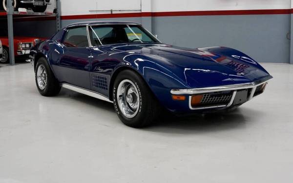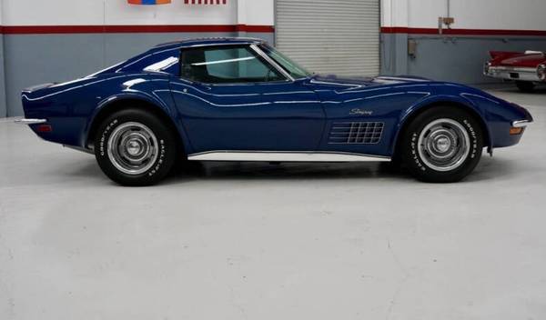 Finished in a striking Blue exterior with a Black leather interior, this Corvette features factory air conditioning and an AM/FM radio, retaining its vintage charm while providing modern comfort. With its unmistakable long-hood styling and powerful drivetrain, this example offers an authentic slice of early-’70s American sports car heritage.