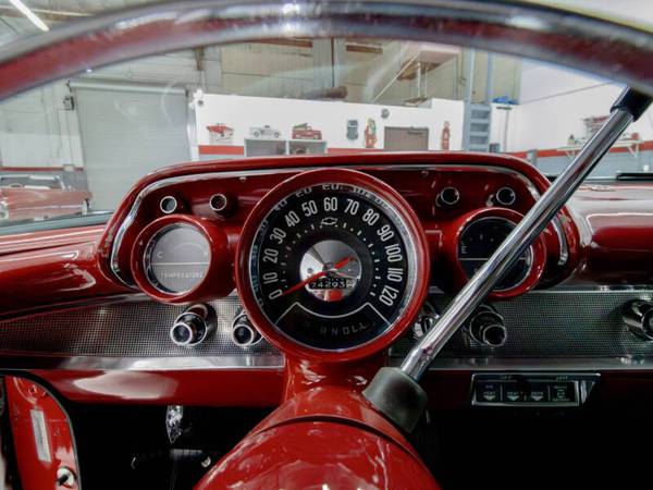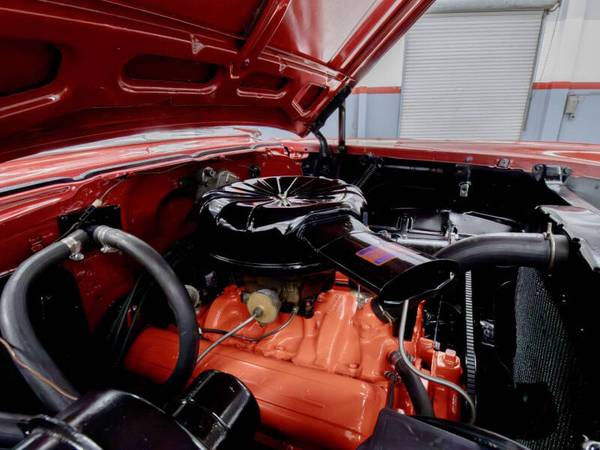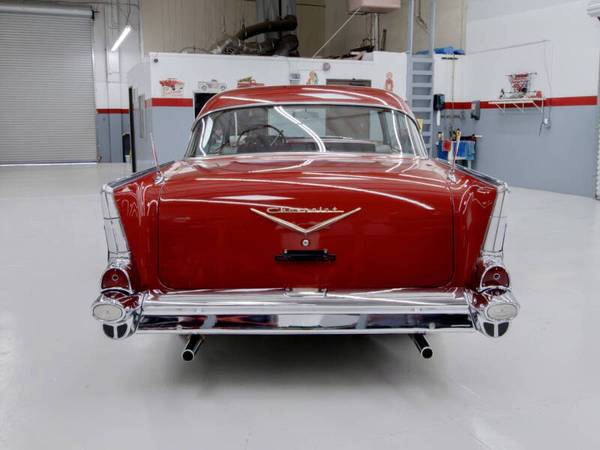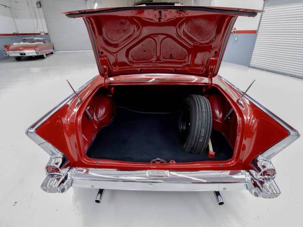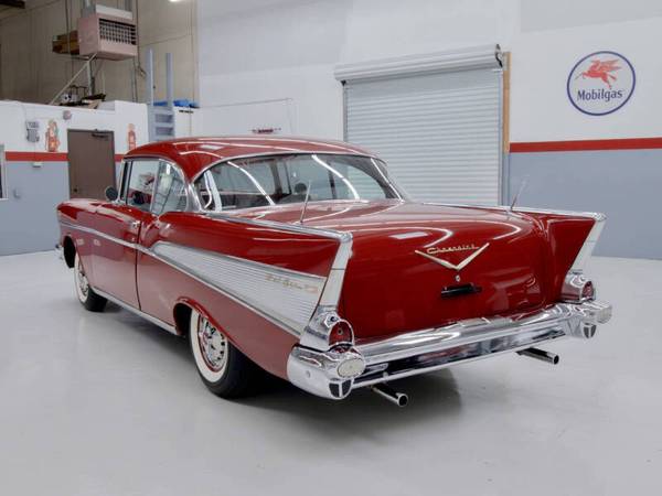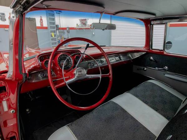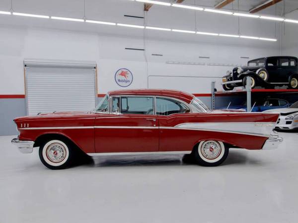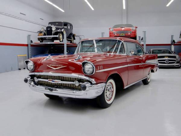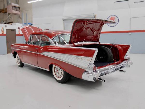This car was refinished in burgundy during the 1980s and fitted with a replacement 327ci V8 paired to a TH350 three speed automatic transmission. The cabin was retrimmed in silver vinyl with black patterned cloth inserts and features a Sony cassette stereo, heater, and split folding front bench seat. Additional details include gold finished trim, dual rear antennas, factory wheels, and dual exhaust. This Bel Air offers an iconic 1950s American look and a solid foundation for continued enjoyment.